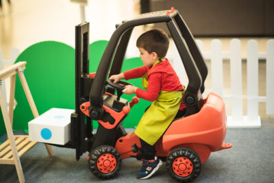 - samokolnice in mini viličarji, ki jih bodo lahko otroci vozili ter prevažali palete in seno;